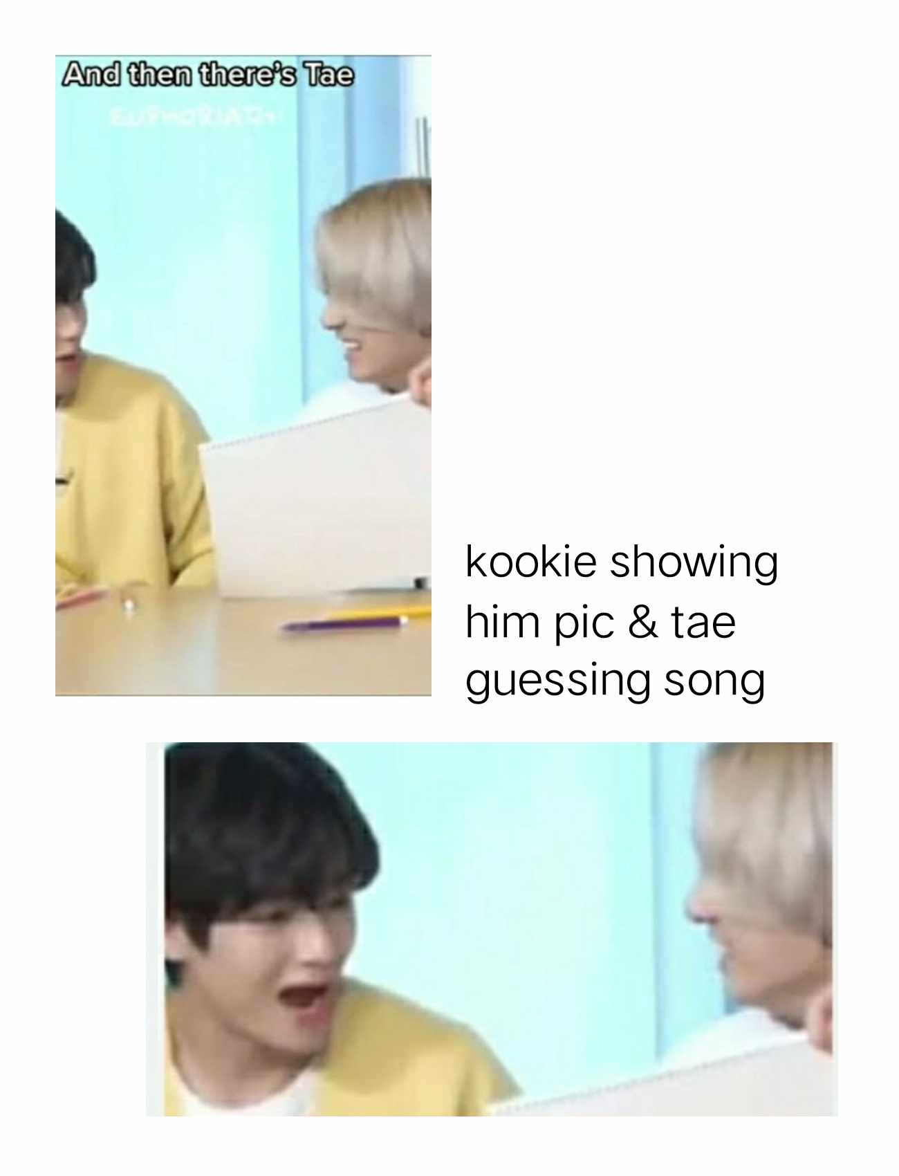 Then kookie draws the pic and showed to tae.... After seeing pic.... Tae immediately guessed song right.... And they won....
