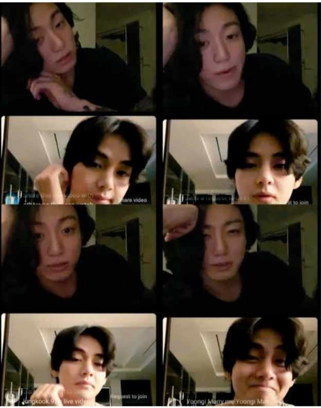 The phone screen flickers to life. The faint strum of guitar strings is heard in the background. The lighting is soft—warm fairy lights glow on the wall, casting a golden haze across the scene. kookie is sitting cross-legged on the floor, wearing an oversized black hoodie. His hair is slightly damp, clearly from a shower. Tae is beside him, half leaning against the couch, dressed in a loose white t-shirt and grey sweatpants. He’s holding Yeontan in his lap... But the twist is they both are live from their own IDs together ..... Their live more look like they're on video call together.... But their armies got it that they're living together and are live from same room but from different Angle.....