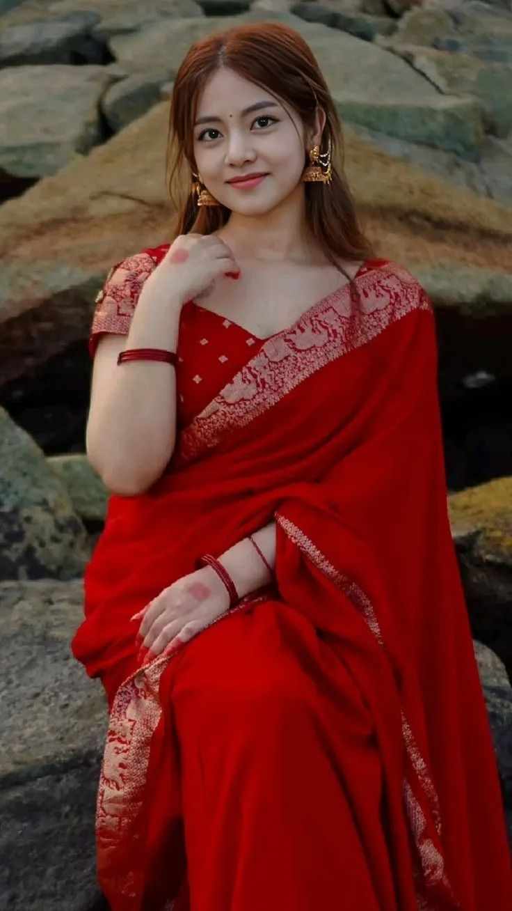 She wore a simple but elegant looking red color saree with golden elephant design boarder with matching golden jhumke and red Bengal's and put a small bindi..... kept her hairs opened..... She did minimal no makeup makeup look.... She was looking so cute and beautiful in this lovely attire..... Then her mom called.....